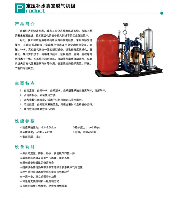 定壓補水脫氣裝置是我公司采用國際先進技術研發的實現集中供熱及中央空調系統定壓、膨脹、補水、真空脫氣四位一體的新型設備。該設備在系統中起到穩壓、自動補水、膨脹自動泄水,脫除系統內游離氣體及溶解氣體等作用。使系統始終處于高效、環保、節能的運動狀態。